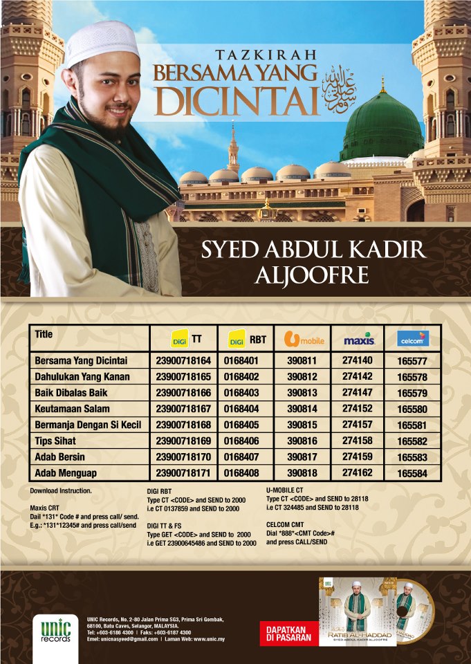 Sebarang pertanyaan mengenai nada dering pemanggil (caller ringtone) tazkirah ini, sila hubungi pejabat urusan UNIC Records di talian +603-6186 4300 / +603-6177 4225 atau emailkan kepada [email protected].
