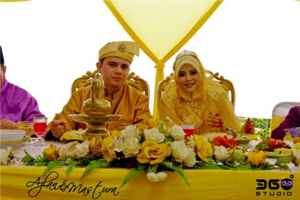 Alan dan Mastura sedondon mengenakan sepasang baju pengantin Melayu berwarna emas.